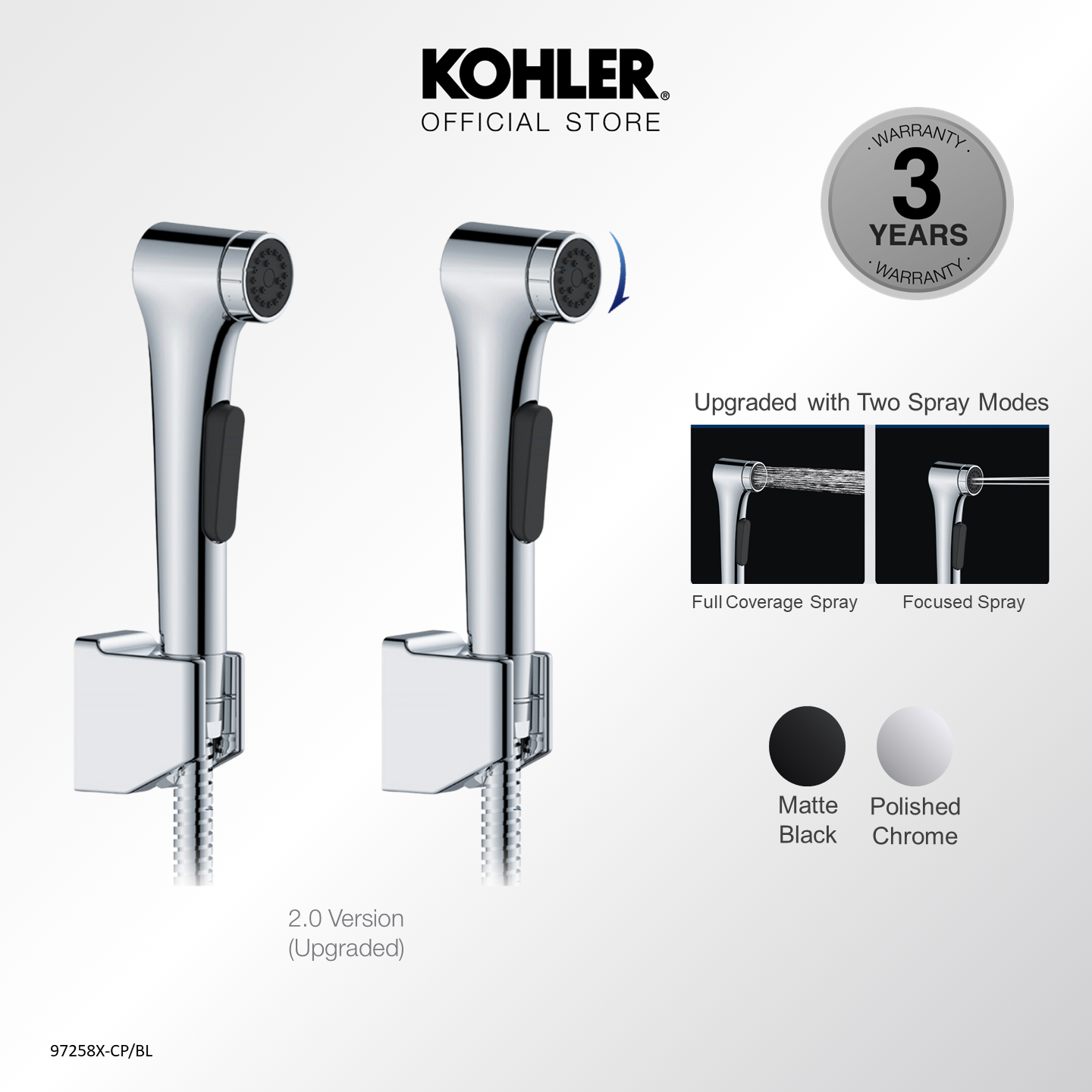 [Upgraded] KOHLER Elate Bidet Spray, Anti-bacterial Hygiene Spray with Wall Bracket & Hose, Polished Chrome 1.0 K-97258X-CP / 2.0 Upgraded K-R29784T-CP / Matt Black 1.0 K-R97258T-B-BL