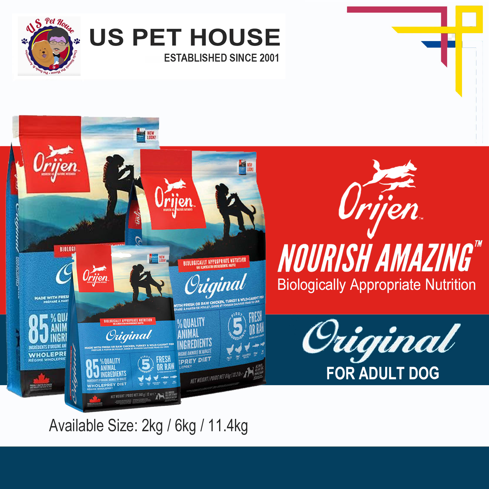 Help your dog thrive with the power of protein-rich recipes that provide peak nourishment. Dogs are ancestral carnivores, so they need a Biologically Appropriate diet rich and varied in whole animal ingredients. ORIJEN®Original diet is packed with 85%1quality animal ingredients like fresh or raw free-run2chicken and turkey, and wild-caught or sustainably farmed fish. Packed with WholePrey animal ingredients like organs and bone, ORIJEN food is made with the most nutrient-dense, succulent parts of the prey to deliver the nutrition dogs need. The result is a diet for your canine companion that is beyond comparison.