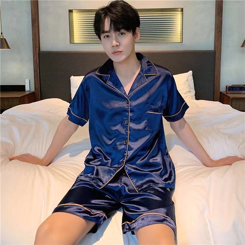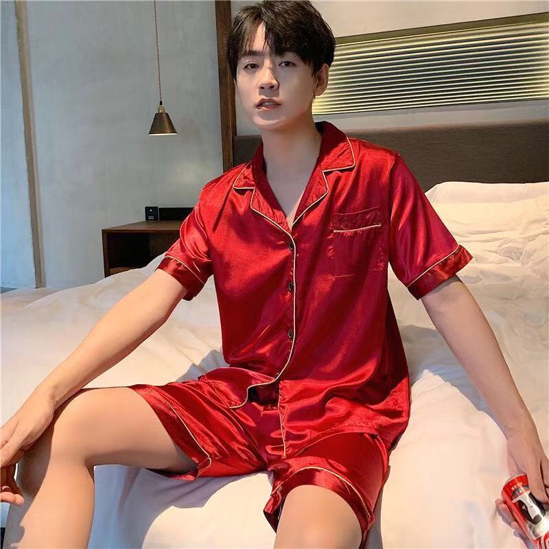 Good Quality Ice Silk Men's Pajamas Spring Summer Short Sleeve and Shorts Thin Pyjamas Youth Solid Color Home Wear Plus Size Set