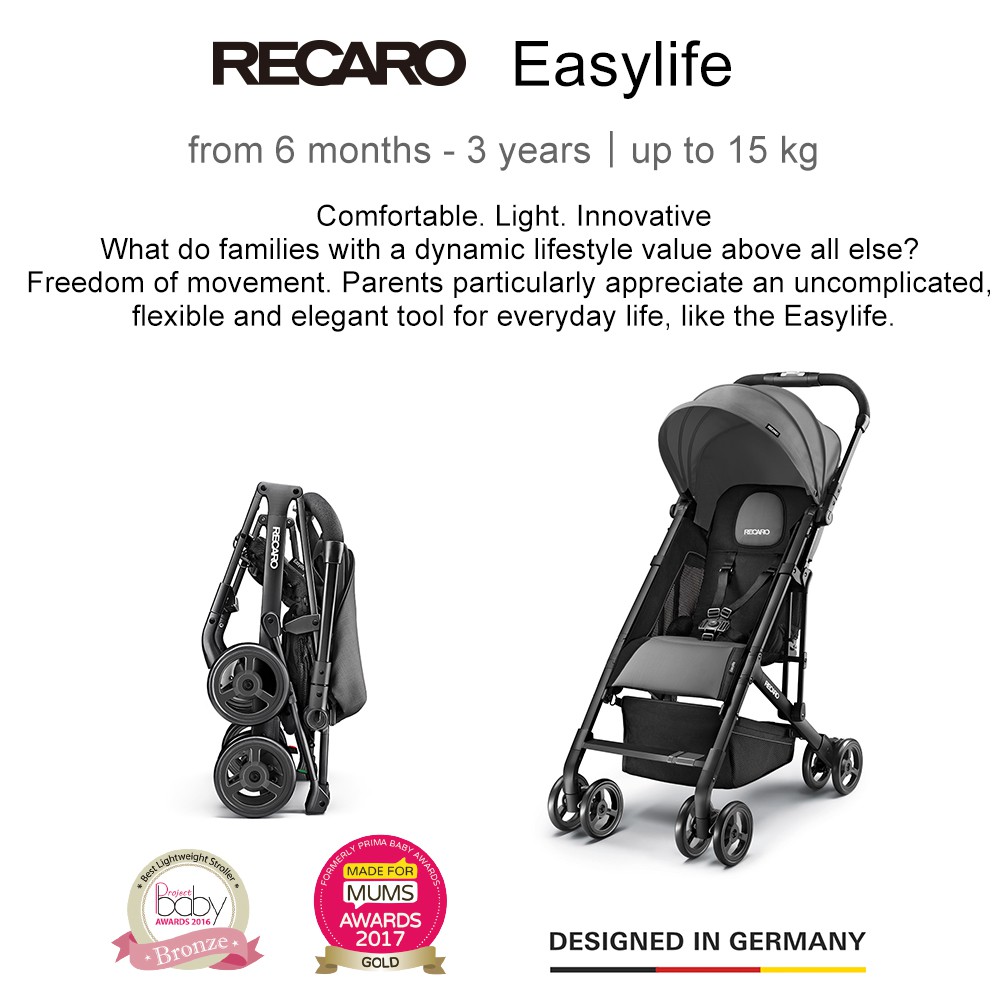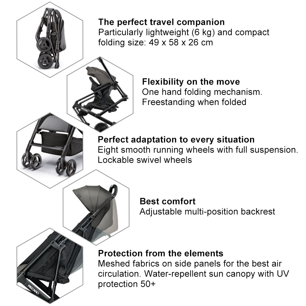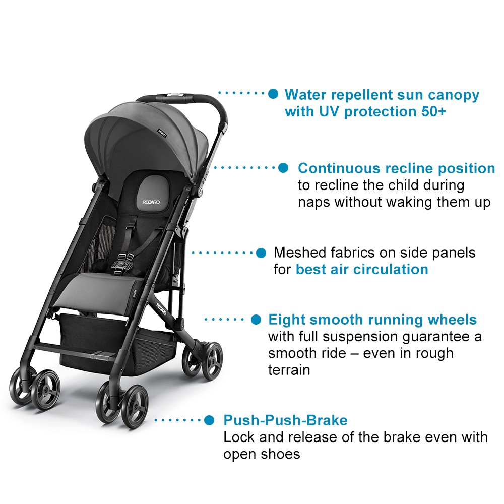 •Stroller is suitable from approximately 6 months above up to 15 kg, approximately 3 years of age •Intuitive one-hand folding mechanism •One of the lightest pushchairs in its class, weighing just 5.7kg •3 layers of sun canopy with UPF 50 and water repellent •5-point seat harness to keep passenger safe and secure •Freestanding when folded •8 smooth, sturdy wheels complete with all-round suspension •Continuous handle and front swivel lockable wheels for easy manoeuvring with only one hand •Removable lockable 360-degree swivelling wheels •Push-Push-Brake: Lock and release of the brake even with open shoes •Backrest is adjustable and can be recline in multiple positions for snoozing or sitting up •Mesh parent peekaboo window offers visibility and ventilation – with integrated magnet for a more comfortable handling of the window flap Meshed fabrics on backrest for more temperature-balancing comfort •Foam material for better seating comfort for the kid •Under-seat shopping basket for groceries and other bags •Compatible with Recaro Car Seat for travel system use