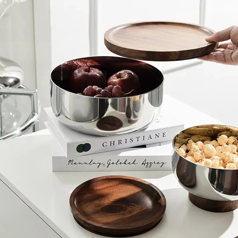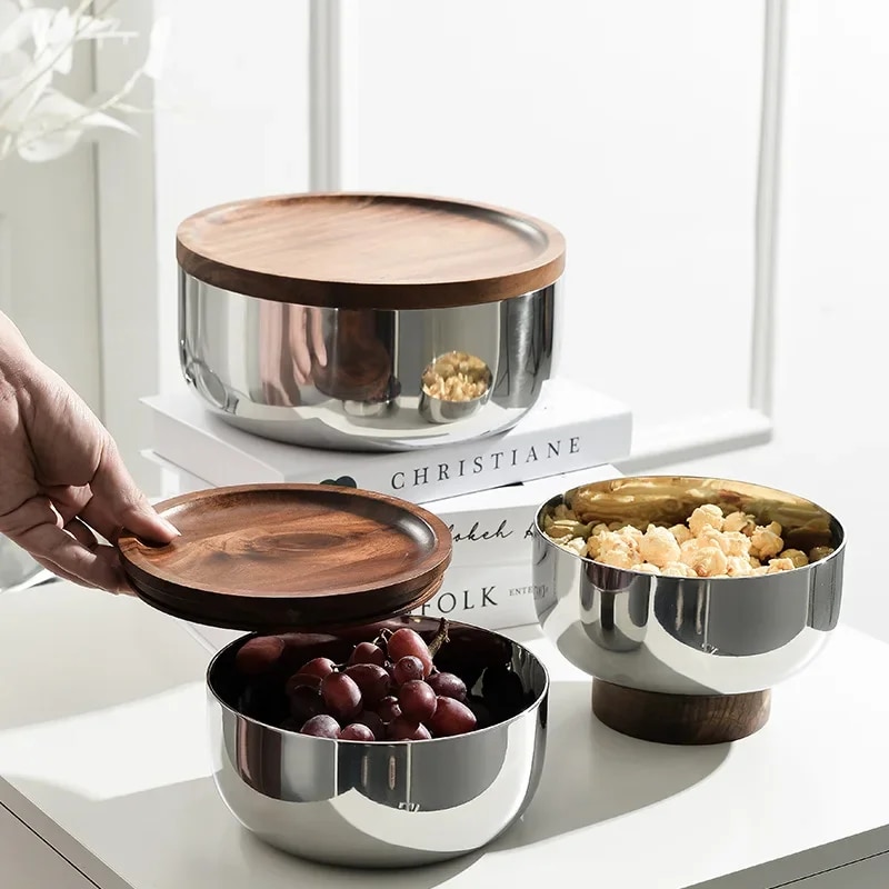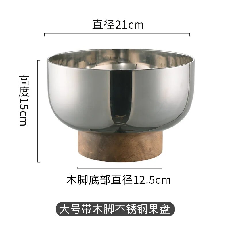 Wood Fruit Tray Three-Layer Stainless Steel Bowl Household Light Luxury High Foot Nut Snacks End Table Storage Decoration