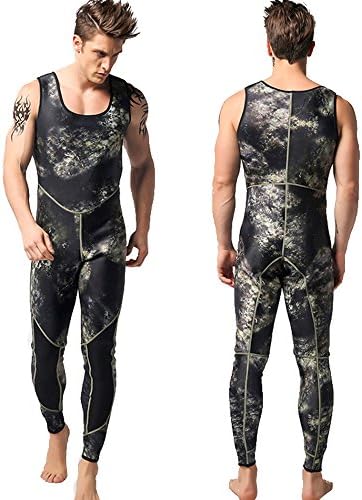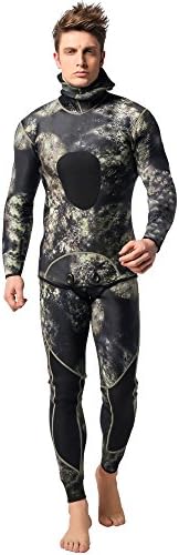 neoprene Import Neoprene: warm, breathable and quick-drying, help to improve the swimming speed and reduce drag of the water. Split Two-piece Design: Wetsuit top with diving hood and wetsuit vest pants as the picture shows, chest and knee pad design, make the diving movement more secure, enjoyable. Warmth and Protection: 3mm neoprene camouflage diving suit provides ample thermal protection and defense against sea lice, jellies and other biological irritants Perfect for all water sports like diving, spearfishing, scuba diving, swimming, surfing, stand-up paddle boarding, wave surfing, kayaking, canoeing, bodyboarding, wakeboarding, windsurfing. WARM TIPS: We have improved the wetsuit size based on customers’ feedbacks, and the size chart is update, please choose the right size according to the size table. Due to the manual measurement, spearfishing Wetsuit size exits ±2cm.