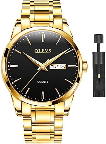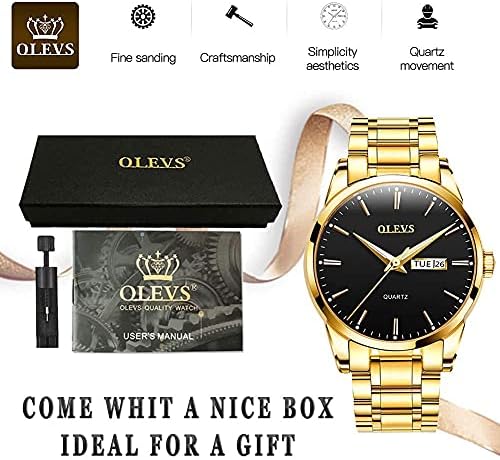 ★Bold Design★ - This watch boasts a black Minimalist dial that gels well with a gold wristband and stainless steel casing. Simplistic design that is both bold and subtle highlights positive masculinity. ★Function★ - Stick-style indices dial with day-date display at 3 o’clock, luminous hands and hour markers, easy to read at all times. Powered by quartz movements and button cells, provides more precise timing and longer service life. ★Reliable Band★- High-polish stainless steel band is durable, anti-allergic and corrosion-resistant. Slick push-button deployment clasp will ensures that you can wear it comfortably. You can custom the band to fit the desired wrist size with the attached watch band tool. ★3ATM Water Resistant★ - Water resistant to 100ft (30m). Suitable for everyday use. Splash/rain resistant. Not suitable for showering, bathing, swimming, snorkelling and water related work. ★Warranty★ - 30 days free return and 1 year warranty. Please feel free to contact us if there are any problems. We will offer you a satisfactory solution within 24 hours. #102,652 in Clothing, Shoes & Jewelry ( ) #321 in
