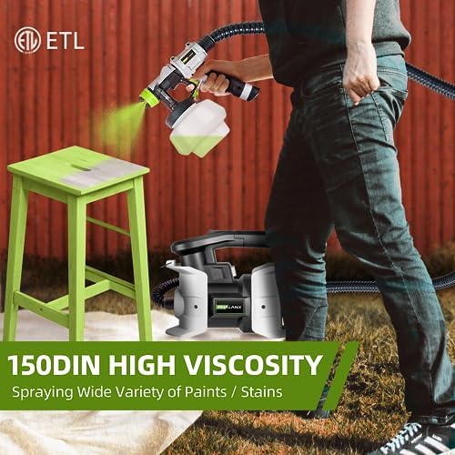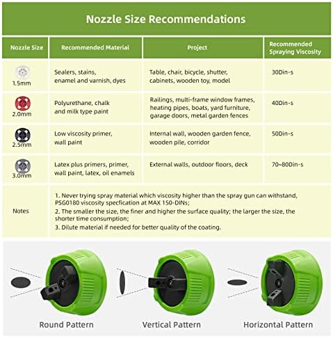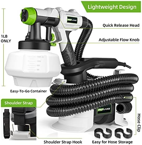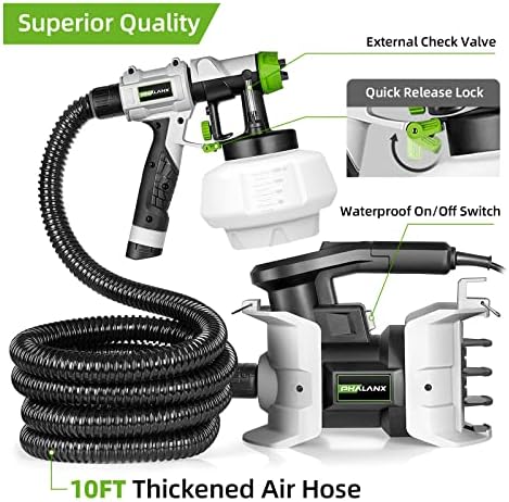 【High Speed HVLP Spray Paint Gun】PHALANX 700W spray painter is equipped with a high speed motor and powerful turbo fan, which makes it paint faster, smoother and even, greatly improving the painting quality. 【150DIN High Viscosity】This electric paint gun adopts 150DIN viscosity, making it suitable for most paints. This powerful spray-painting gun can ensure that you can finish all kinds of painting projects quickly and smoothly. Great for home improvement and DIY lovers. 【Lightweight Design & 10FT Flexible Air Hose】The body separation design makes the spray gun only weigh 1LB, which greatly relieves the pressure on arm and hand. Lengthened hose makes the painting range up to 780FT². Ideal for beginners. 【4 Nozzles & 3 Patterns】4 nozzles (1.5mm/2.0mm/2.5mm/3.0mm) can meet different painting requirements! By adjusting the air cup, 3 painting patterns can be obtained to finish your project. Air flow knob can adjust the flow to realize accurate output and save materials. 【ETL Certified & Warranty】It has ETL certification from the authoritative organization to ensure product quality and safety. And it also has 30 days UNCONDITIONAL return. Any questions, contact [
