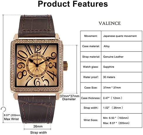 Valence Watch for Women. Women's Vintage Square Watches Classic Ladies Quartz Watches with Leather Watch Band Women's Wrist Watches