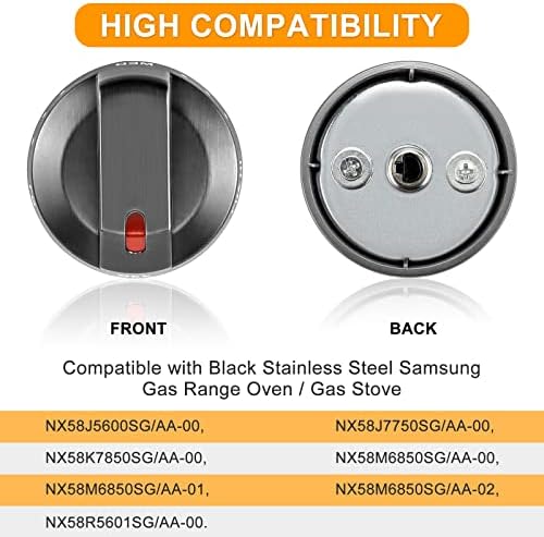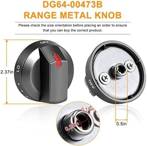 【PERFECT FIT】- The DG64-00473B Samsung range surface burner knob is compatible with stainless steel samsung gas range/ oven/ stove, Fit for Samsung Range Oven: NX58J5600SG/AA-00, NX58J7750SG/AA-00, NX58K7850SG/AA-00, NX58M6850SG/AA-00, NX58M6850SG/AA-01, NX58M6850SG/AA-02, NX58R5601SG/AA-00. 【SUPER CRAFT】- ① This DG64-00473B Samsung gas stove knob surface is brushed to enhance the overall vision of the stove, ② The back is made of stainless steel structure, which has balanced characteristics. ③ To extend the service life, the upgraded knob has a special widening of the "D" interface adopts to better fit the size of the furnace bottom shaft, won't be cracked easily. 【EASY TO SET】:DG64-00473B range stove knobs can fix the following symptoms:①Will not start②Will not select setting③Will not turn. ? To replace knobs, do not bend the knob up or down, slide the knob directly out of the stem, and slide the replacement knob back to the stem. It is normal that the D-type port is too small for the first use, and lubricating oil can be applied to assist the installation. 【PRODUCT SPECIFICATIONS】- 5 × DG64-00473B Gas Stove Knob for Samsung. ② Size: 2.3 inches /5.6 cm in diameter, "D" design: 0.17 inch in interface (Please refer to the picture for details). Before purchasing, please check the part number or measure the original size to make sure that the shape and size are the same!To avoid receiving unsuitable products 【Good After Sales】: We support return and exchange within 365 days, we have a professional after-sales service team, we will solve your problem within 24 hours, please give us a chance.