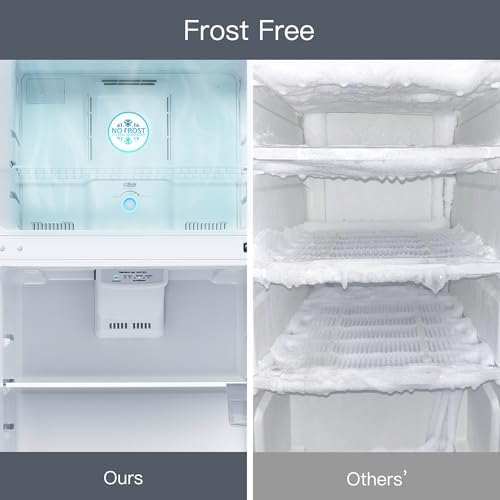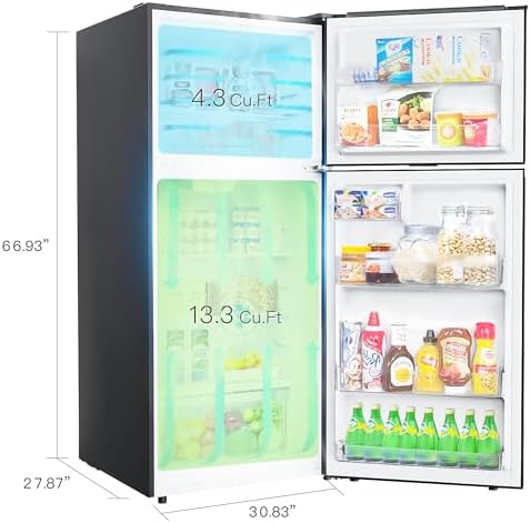 【LARGE CAPACITY & SPACE SAVING】 This top freezer refrigerator offers a generous 17.6 cubic feet capacity. The upper layer features a 4.3 cuft freezing area, while the lower layer provides a 13.3 cuft refrigeration area. It's an excellent choice for keeping cool drinks, fruits, vegetables, meat, and other fresh foods. 【ENERGY SAVING & LOW NOISE】 The top-mount refrigerator utilizes an R600a high-efficiency, low-energy consumption compressor, which cools food quickly while consuming less energy and producing minimal noise. Interior bright LED lighting makes it convenient to locate the food you need. It features a two-way airflow system, ensuring even and balanced airflow inside, and provides a long-lasting, balanced freshness preservation space. 【NO FROST OPERATION】 No More Defrosting Hassles! Frost-free refrigerators are equipped with a system that automatically defrosts the freezer and prevents the buildup of frost and ice. Frost-free refrigerators help preserve the quality and flavor of your food items, reducing food waste. With no need for manual defrosting, there is no wasted space due to ice buildup. 【REVERSIBLE DOOR】 A reversible door adds convenience, allowing you to adjust the door swing to suit your kitchen, apartment, RV, garage, camper, or basement. 【AFTER SALES SERVICE】 Our full size refrigerator come with a one-year warranty period. During this time, if you encounter any problems with your refrigerator, please feel free to contact us, and we will be happy to assist you in resolving them.